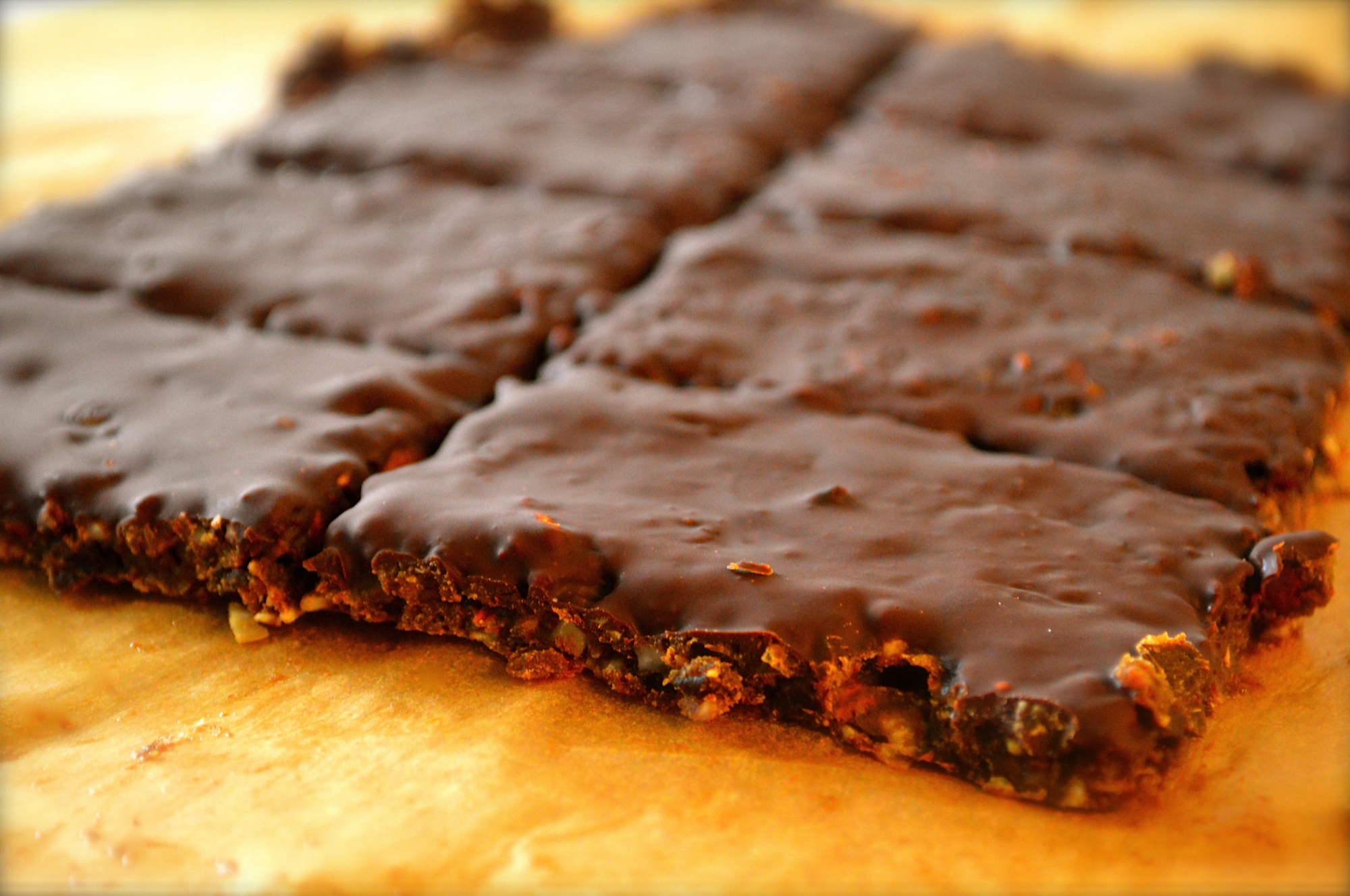 Smält 40g mörkchoklad (90%) bred över. In i frysen.